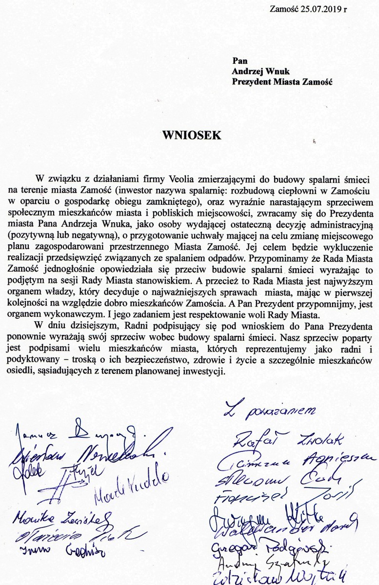 Wniosek Radnych Rady Miasta Zamościa do Prezydenta Miasta w sprawie spalarni śmieci