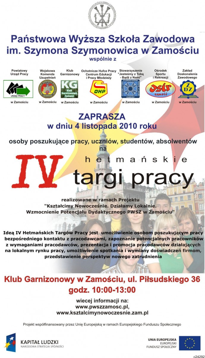 Jeśli przynajmniej na jedno z powyższych pytań odpowiedziałeś twierdząco, nie może Ciebie zabraknąć na IV Hetmańskich Targach Pracy organizowanych przez Państwową Wyższą Szkołę Zawodową im. Szymona Szymonowica w Zamościu w ramach projektu PO KL „Kształcimy nowocześnie. Działamy lokalnie. Wzmocnienie potencjału dydaktycznego PWSZ w Zamościu”. Współorganizatorami targów są: Powiatowy Urząd Pracy w Zamościu, Wojskowa Komenda Uzupełnień, Klub Garnizonowy, Ochotnicze Hufce Pracy, Stowarzyszenie „Jesteśmy z Tobą – Bądź z Nami”, Ośrodek Sportu i Rekreacji w Zamościu oraz Zakład Doskonalenia Zawodowego w Zamościu. Targi pracy są najlepszą okazją aby w jednym miejscu i czasie poznać aktualne oferty lokalnego rynku pracy, porozmawiać z pracodawcami, złożyć dokumenty aplikacyjne, otrzymać katalog targowy oraz materiały informacyjne przygotowane przez pracodawców. Najbliższa edycja Hetmańskich Targów Pracy odbędzie się w dniu 4 listopada 2010 roku (czwartek) w godz. 10.00 – 13.00 w Klubie Garnizonowym w Zamościu przy ul. Piłsudskiego 36. Program Targów Pracy 9:30 – 10:00Rejestracja wystawców 10:00 – 10:30Uroczyste otwarcie Targów Pracy – wystąpienia gości 10:30 – 11:00Seminarium „Staże zagraniczne szansą dla młodych w ramach programu „Leonardo da Vinci” - prowadzący Jan Kozyra, Dyrektor Powiatowego Urzędu Pracy w Zamościu 11:30 – 12:00Seminarium „Służba przygotowawcza i służba w Narodowych Siłach Rezerwowych to twoja szansa” – prowadzący mjr Wacław Czeczko 10:30 – 13:00Prezentacja firm i instytucji na poszczególnych stoiskach 13:00Zakończenie Targów Zapraszamy wszystkich zainteresowanych !