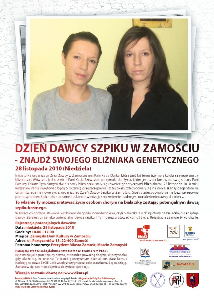 Tym samym dwie siostry bliźniaczki stały się również genetycznymi bliźniakami. 25 listopada 2010 roku wszystkie Panie świętować będą 5 rocznicę przeszczepienia i z tej okazji zdecydowały się na danie szansy pacjentom na całym świecie na nowe życie, organizując Dzień Dawcy Szpiku w Zamościu. Siostry zdecydowały się na bezinteresowną pomoc, ponieważ jak mało kto, same doskonale wiedzą jak niezmiernie trudne jest odnalezienie dawcy dla biorcy.Rejestracja potencjalnych dawców odbędzie się: