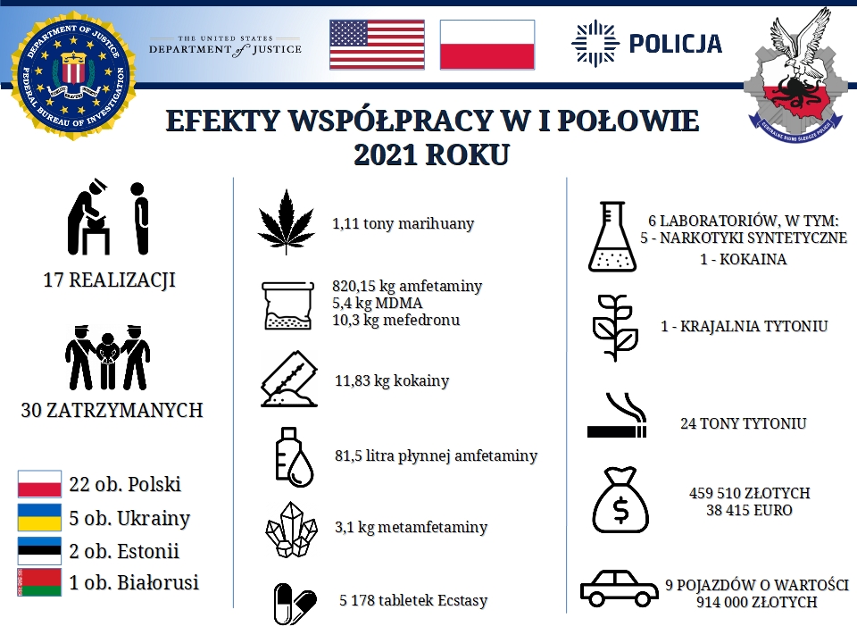 dodano: 27.07.2021Centralne Biuro Śledcze Policji uczestniczyło w międzykontynentalnej operacji policyjnej koordynowanej przez amerykańskie Federalne Biuro Śledcze (FBI) we współpracy z Europolem. Efektem ponad 3-miesięcznej pracy jest przejęcie ponad 2 ton narkotyków wartych ok. 84 mln zł, 24 ton tytoniu, zlikwidowanie 6 laboratoriów i 5 magazynów narkotykowych, a także krajalni tytoniu, rozbicie 9 zorganizowanych grup przestępczych i zapobieżenie planowanym przestępstwom. Podczas działań zatrzymano 30 osób.