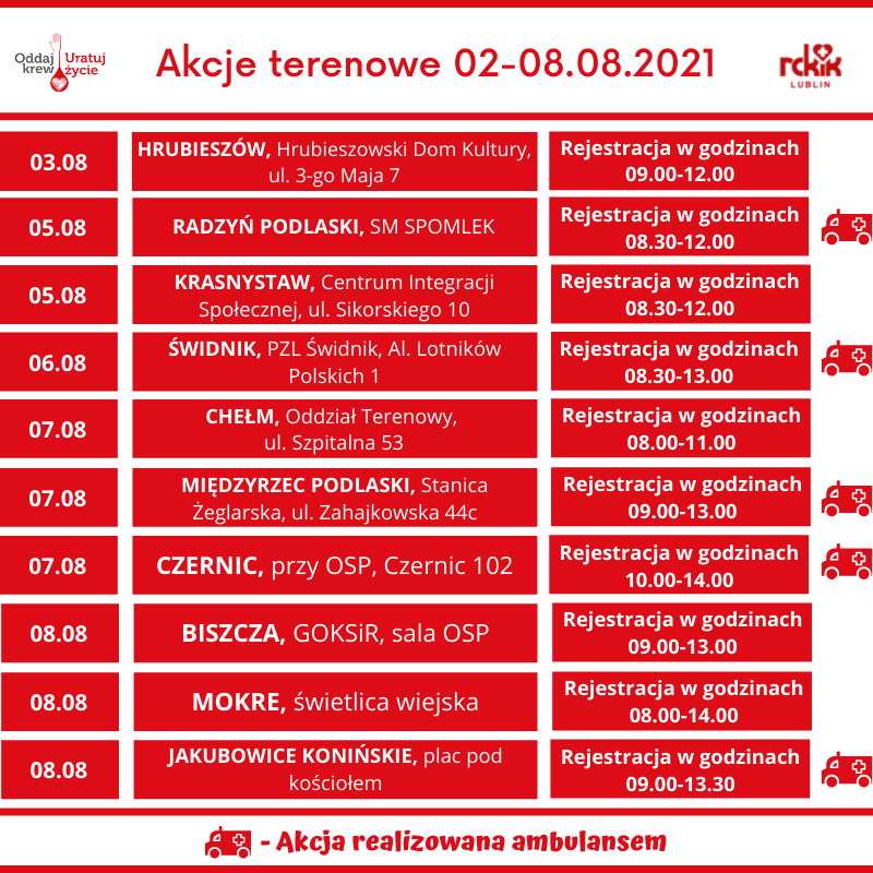 05.08.2021 (czwartek) RADZYŃ PODLASKI, SM SPOMLEK (AMBULANS), rejestracja dawców w godz. 8.30-12.00