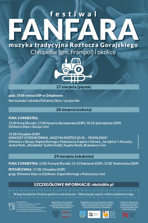 dodano: 24.08.2021Fanfara, to orkiestrowa Fura wędrująca od remizy do remizy między roztoczańskimi wzgórzami, potańcówki na dechach do muzyki orkiestr dętych oraz kapel skrzypcowych rekonstruujących brzmienie roztoczańskich muzykantów sprzed 100 lat, stare weselne pieśni od których ciarki przechodzą po plecach. Festiwal Fanfara to bliskie spotkanie z muzycznym folklorem w jego surowej, nieprzetworzonej wersji. A wszystko to w zjawiskowym krajobrazie zachodniego Roztocza i w szczycie sezonu malinowego.