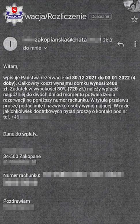 Młody mężczyzna otrzymał informacje o konieczności wpłacenia zadatku za pobyt w kwocie 720 złotych. Pieniądze wpłacił na wskazane w mailu konto bankowe. Po dokonanej płatności kontakt z osobą z ogłoszenia został zerwany.