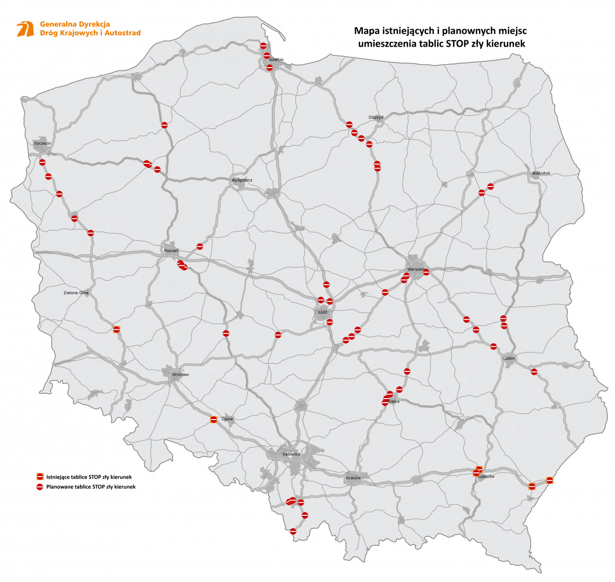 Kolejnych 111 tablic ostrzegających przed wjazdem pod prąd, pojawi się w kilkudziesięciu lokalizacjach, zarówno w obrębie węzłów jak i MOP-ów. Tablice ustawimy między innymi na autostradowych węzłach Łódź Górna i Piątek na A1 oraz Stryków i Zgierz na A2. Pozostałe dotyczą węzłów na drogach ekspresowych lub MOP-ów: