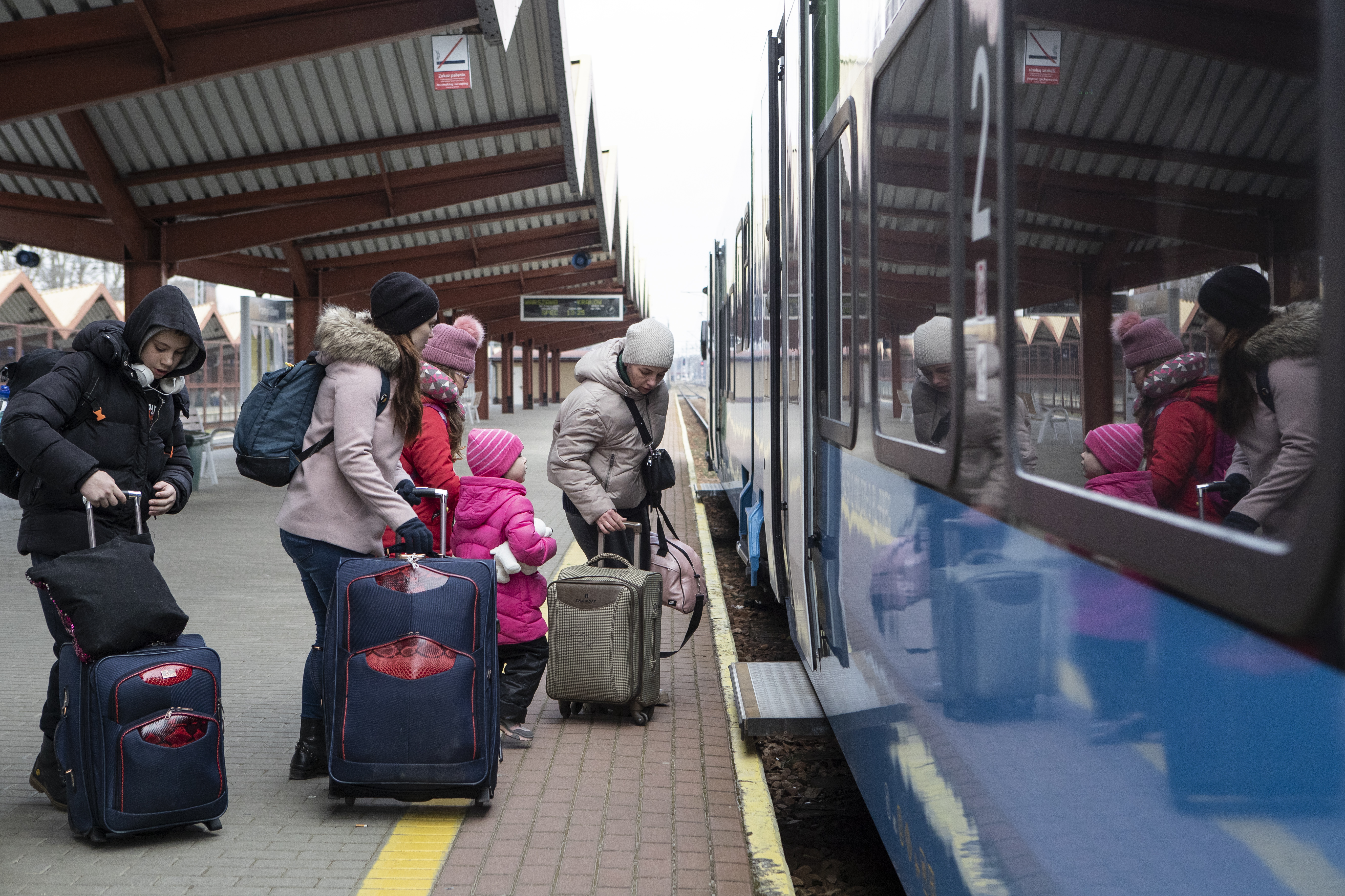 Na fot. Uchodźcy na stacji w Przemyślu na chwilę przed odjazdem do Krakowa.