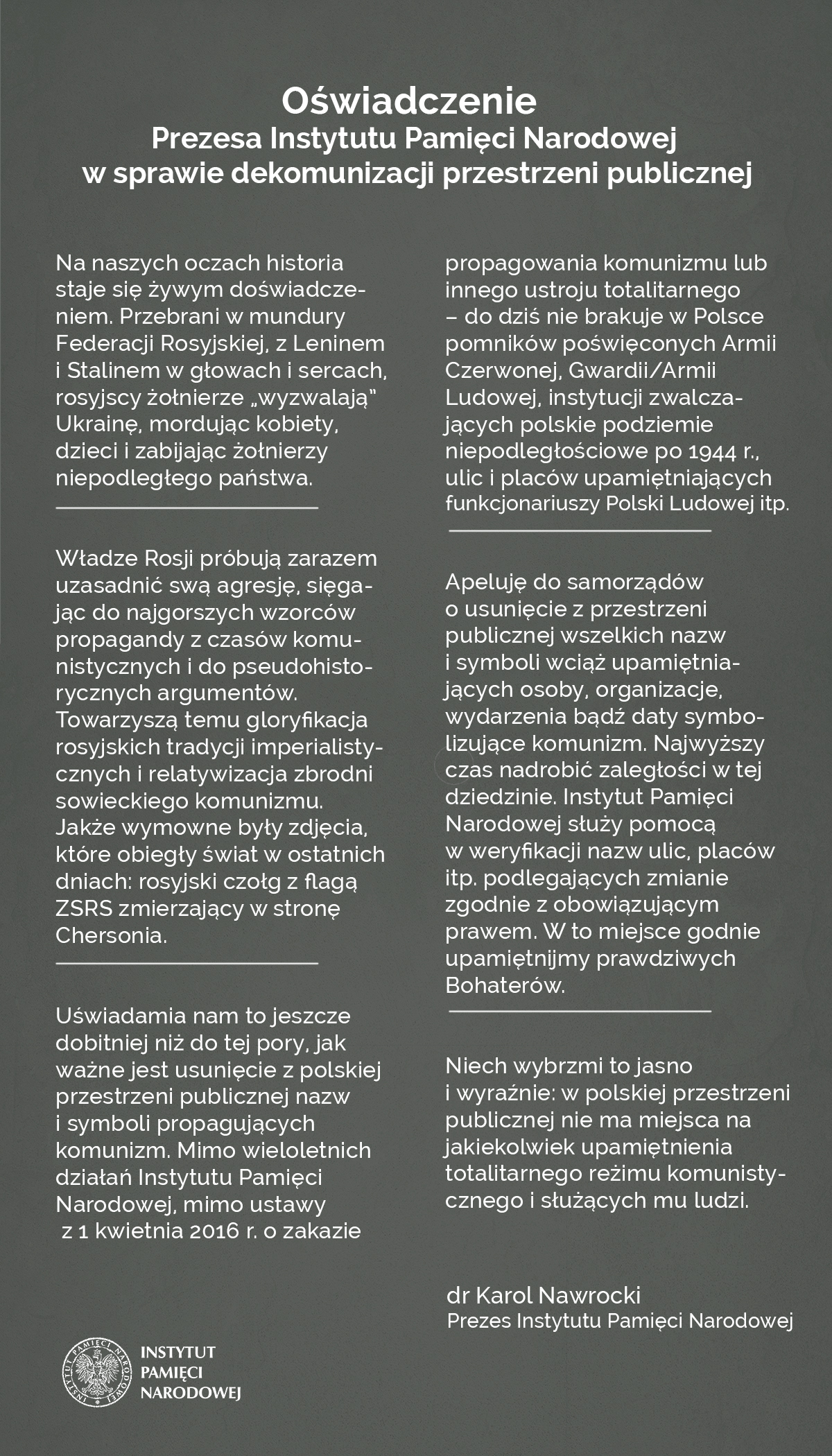 dodano: 05.03.2022W kontekście napaści Rosji na Ukrainę, Prezes Instytutu Pamięci Narodowej, dr Karol Nawrocki wystosował oświadczenie ws. potrzeby konsekwentnej dekomunizacji przestrzeni publicznej w kraju i za granicą. Oświadczenie o podobnej treści skierowane jest do władz samorządowych i instytucji publicznych w Polsce oraz do państw europejskich, w szczególności krajów byłego bloku komunistycznego.