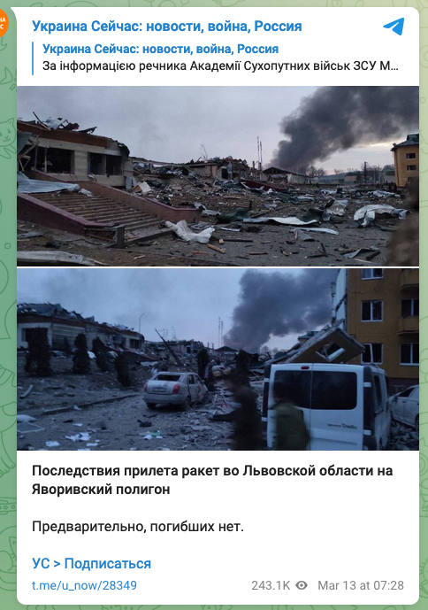 dodano: 13.03.2022W nocy miał miejsce rosyjski ostrzał blisko polskiej granicy. Pociski spadły w Jaworowie. na międzynarodowe Centrum Sił Pokojowych i Bezpieczeństwa. O 3:30 natomiast ogłoszono alarm przeciwlotniczy we Lwowie. — przekazały władze obwodu lwowskiego.