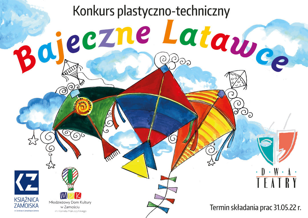 Organizując konkurs chcemy aktywnie włączyć się w XXI edycję Festiwalu Teatru Polskiego Radia i Teatru Telewizji Polskiej „Dwa Teatry 2022”, który odbędzie się w Zamościu w dniach 10-13 czerwca. Latawce zgłoszone do konkursu zostaną zaprezentowane w przestrzeni Starego Miasta podczas Festiwalu, tworząc „bajeczną”, teatralną dekorację.