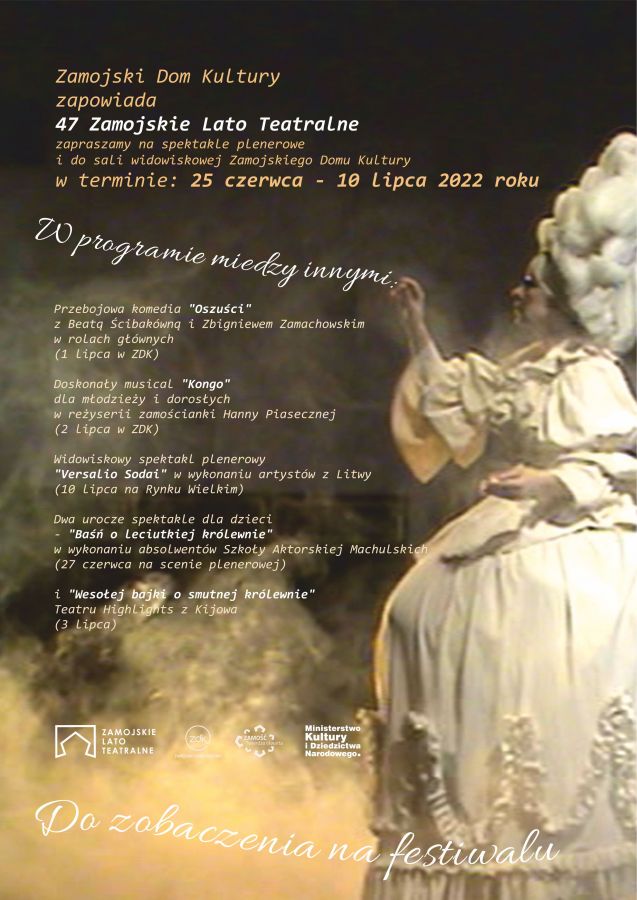 dodano: 08.04.2022Zamojski Dom Kultury zapowiada 47 Zamojskie Lato Teatralne zapraszamy na spektakle plenerowe i do Sali widowiskowej Zamojskiego Domu Kultury w terminie: 25 czerwca – 10 lipca 2022 r.