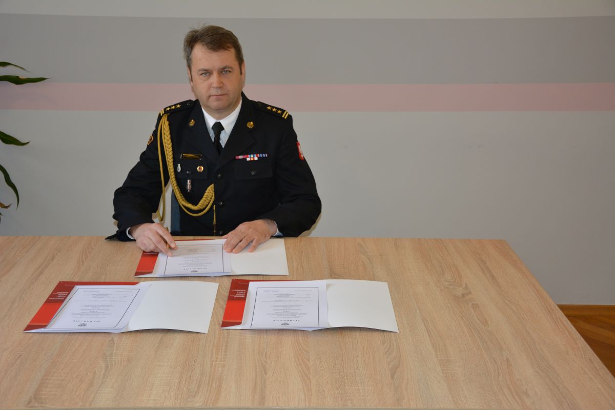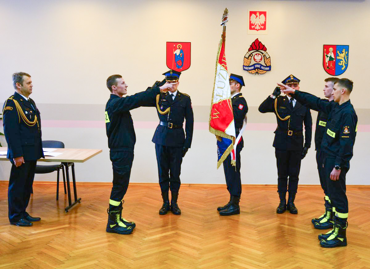 dodano: 08.04.20226 kwietnia br., podczas uroczystej zbiórki zorganizowanej w sali konferencyjnej Komendy Miejskiej PSP w Zamościu w obecności st. bryg. Jacka Sobczyńskiego komendanta miejskiego PSP w Zamościu, odbyło się uroczyste ślubowanie na sztandar nowych adeptów pożarnictwa, którzy jesienią ubiegłego roku przeszli pozytywnie nabór do służby. Nowi strażacy to: Paweł Borys, Bartłomiej Suszek Damian Kozyra.