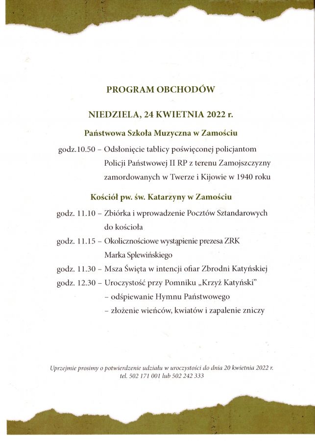 dodano: 20.04.2022Stowarzyszenie Zamojska Rodzina Katyńska w Zamościu, Kościół Rektoralny pw. św. Katarzyny w Zamościu, Prezydent Miasta Zamość, 3. Zamojski Batalion Zmechanizowany w Zamościu zapraszają na obchody 82. Rocznicy Zbrodni Katyńskiej.