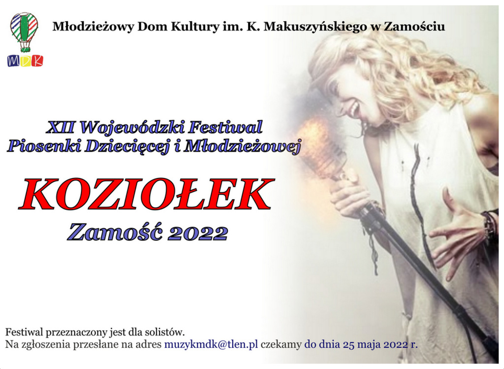 * osoby zainteresowane udziałem w festiwalu przesyłają do dnia 25 maja 2022 r. wypełnioną kartę zgłoszenia i klauzulę na adres muzykmdk@tlen.pl;