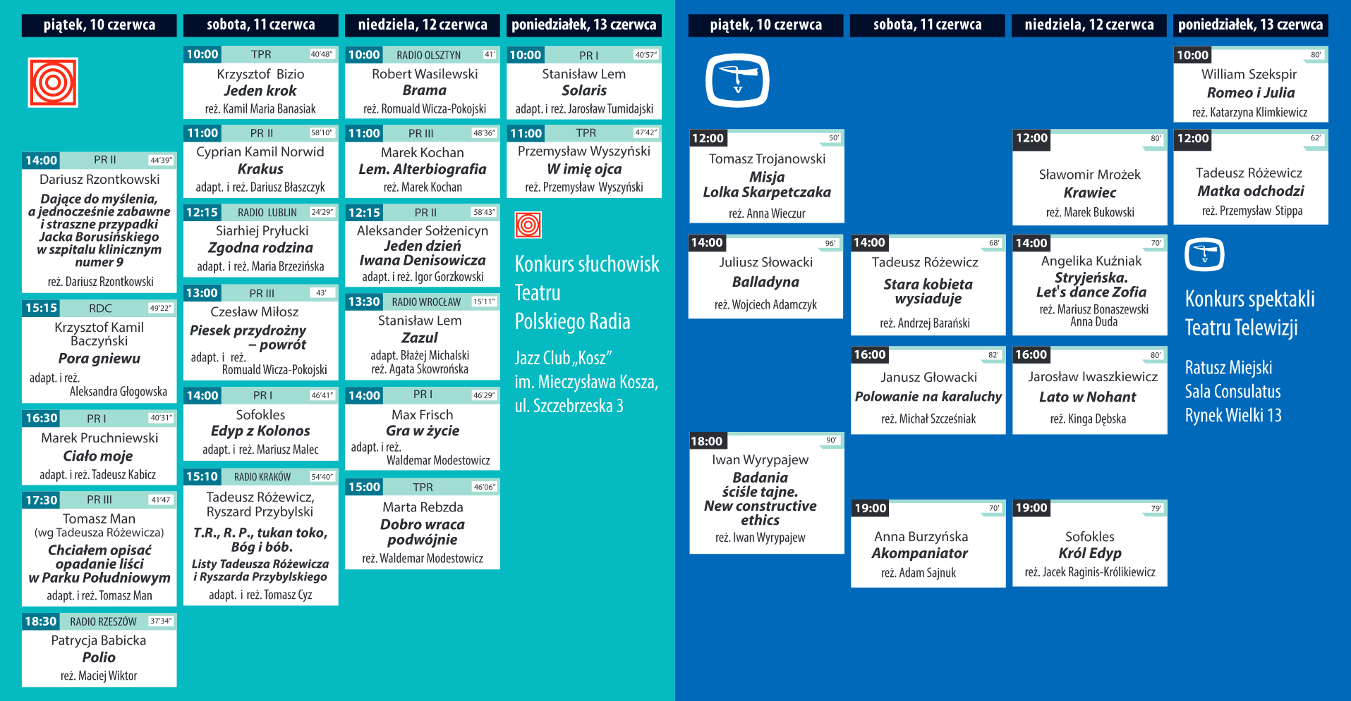 dodano: 03.06.2022Czterodniowy festiwalowy maraton zainauguruje gala na Rynku Wodnym w piątek 10 czerwca, której punktem kulminacyjnym będzie wręczenie Wielkiej Nagrody. W tym roku za całokształt dokonań artystycznych zostaną uhonorowani Magdalena Zawadzka i Andrzej Mastalerz. Od rana do wieczora widzowie i słuchacze będą mogli ocenić 12 spektakli telewizyjnych i 19 słuchowisk radiowych rywalizujących o główną nagrodę „Dwóch Teatrów”. Spektakle – wzorem roku poprzedniego – zostaną odtworzone w sali Consulatus, natomiast aby posłuchać słuchowisk radiowych należy pofatygować się do Jazz Club Kosz.