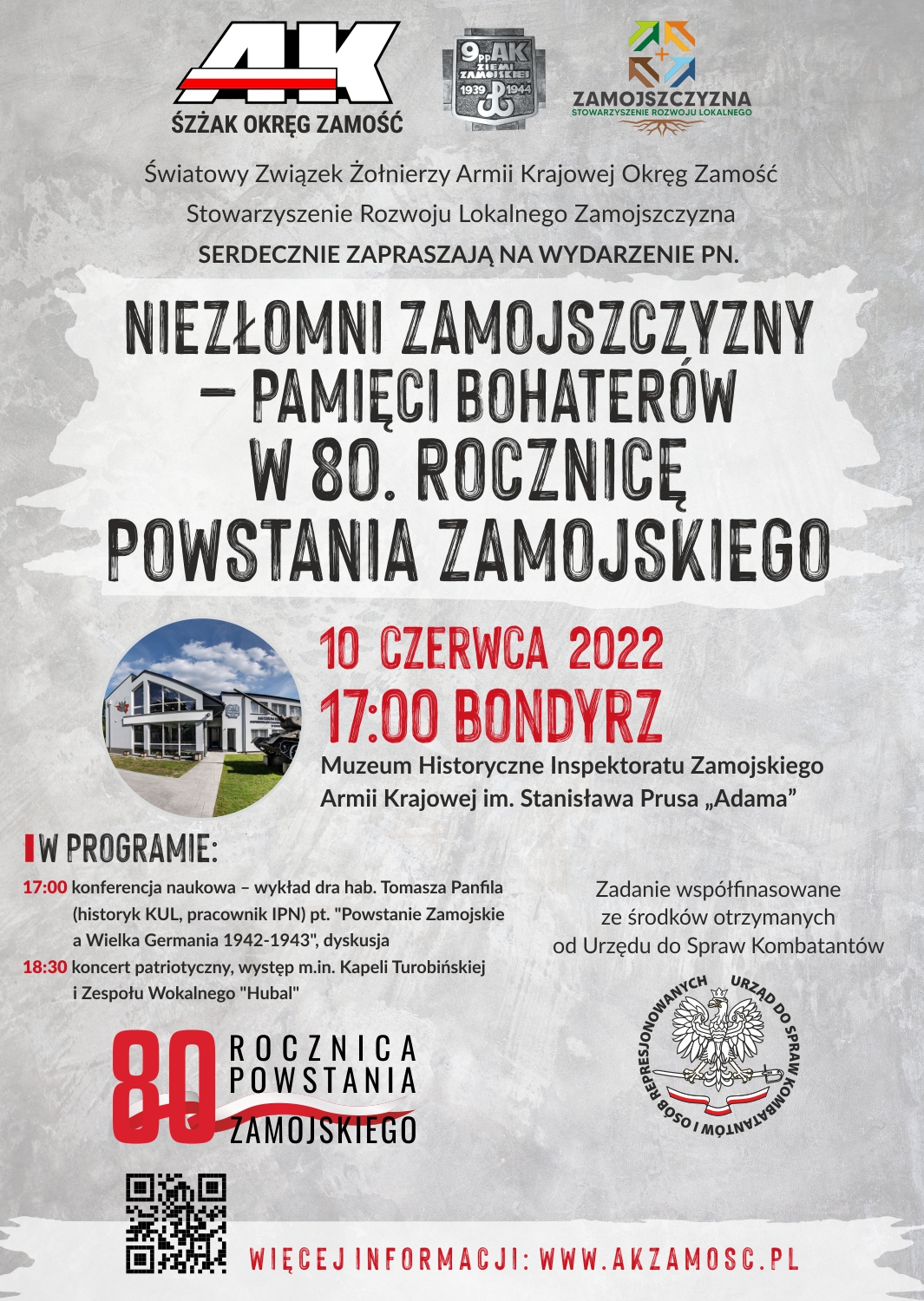 Serdecznie zapraszamy do udziału w organizowanym w ramach ww. rocznicy wydarzeniu pn. „Niezłomni Zamojszczyzny – Pamięci bohaterów w 80. Rocznicę Powstania Zamojskiego”, które odbędzie się 10 czerwca 2022 r. (piątek), godz. 17.00 w Muzeum Historycznym Inspektoratu Zamojskiego Armii Krajowej w Bondyrzu. W programie spotkania zaplanowana jest konferencja naukowa - wykład i dyskusja z zaproszonym gościem - dr. hab. Tomaszem Panfilem (historyk KUL, pracownik IPN) pt. "Powstanie Zamojskie a Wielka Germania 1942-1943".