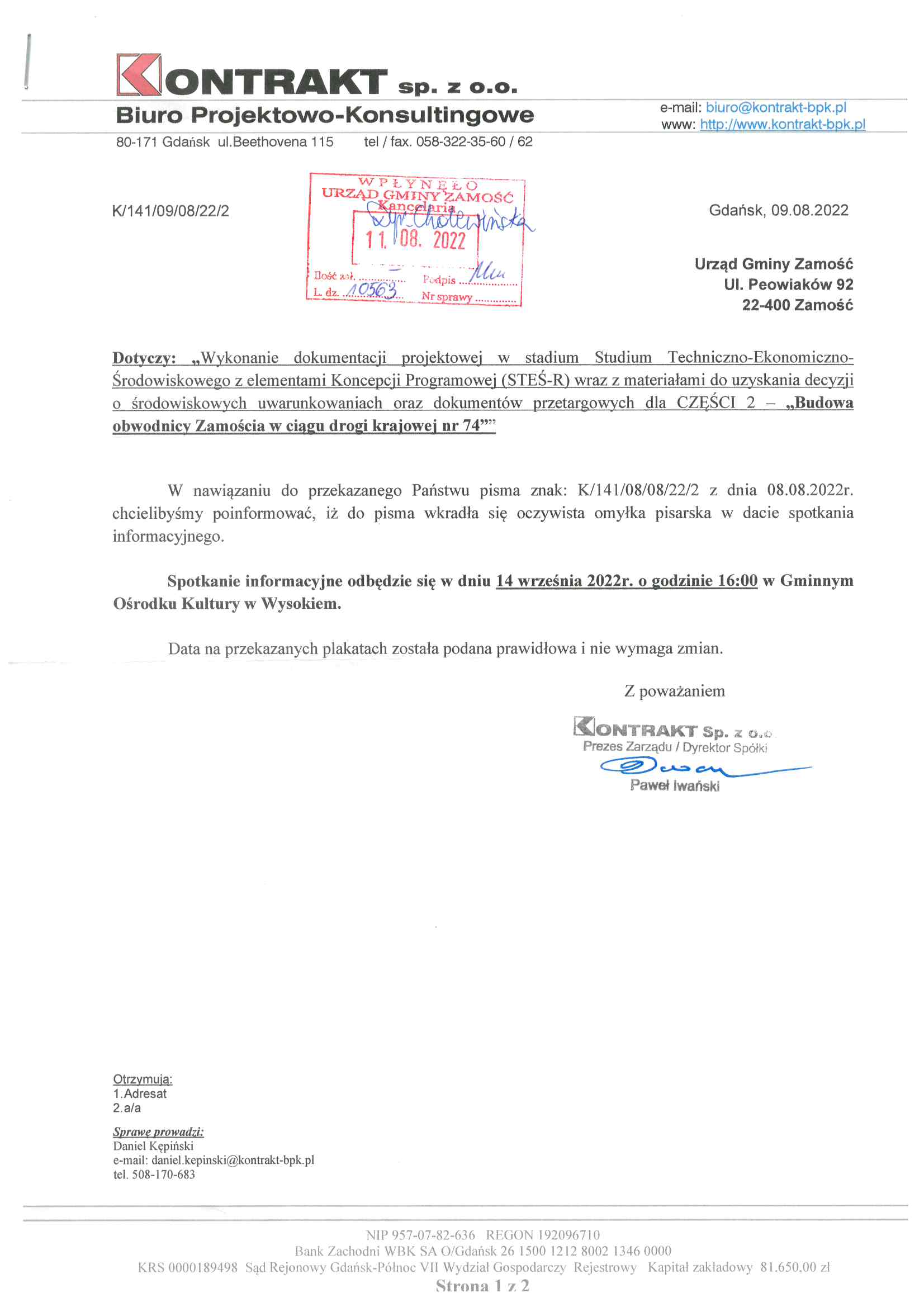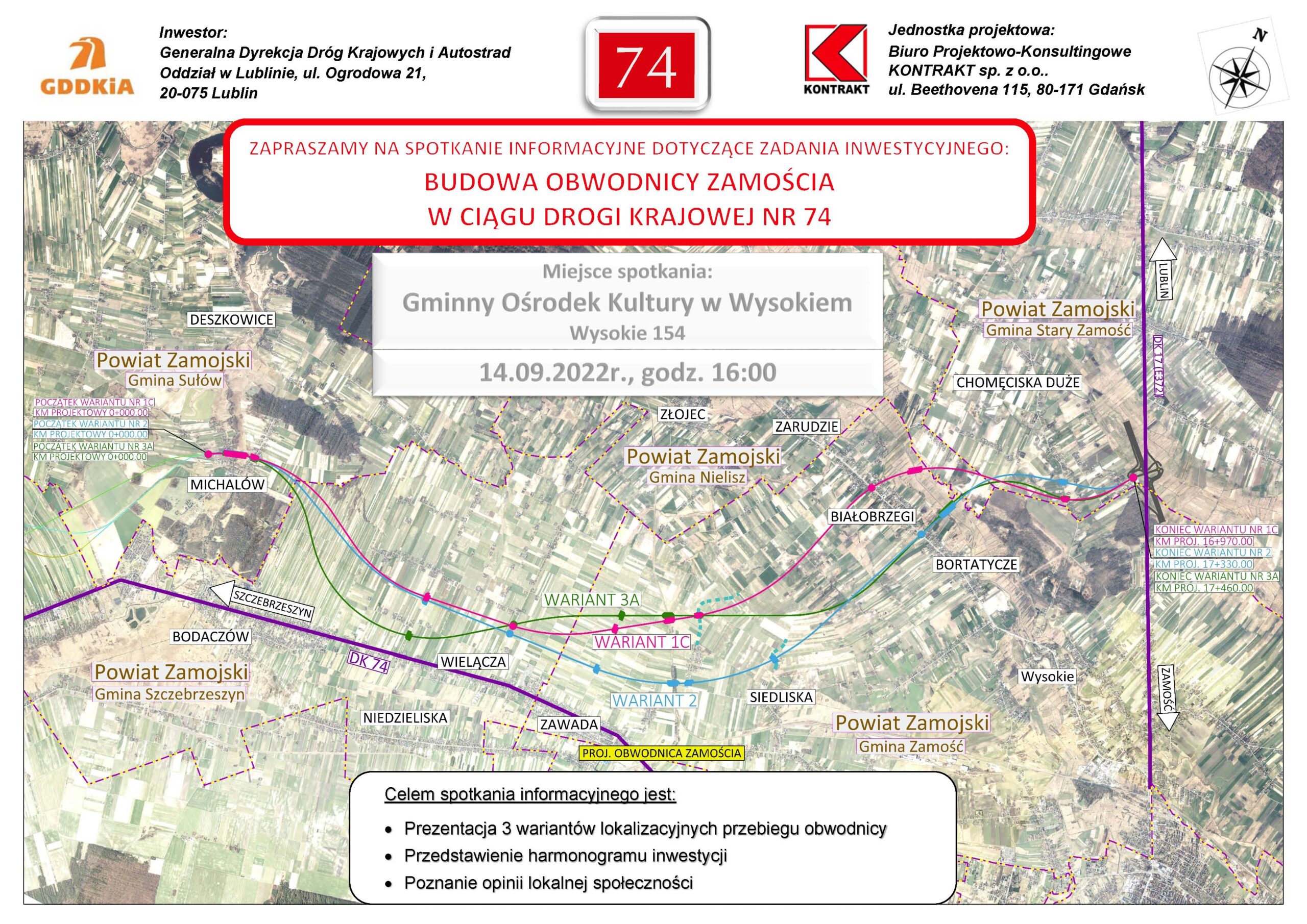 dodano: 19.08.2022Informujemy, że Biuro Projektowo-Konsultingowe Kontrakt sp. z o.o. realizujące na zlecenie Generalnej Dyrekcji Dróg Krajowych i Autostrad Odział w Lublinie wykonanie dokumentacji projektowej w stadium Studium Techniczno-Ekonomiczno-Środowiskowego z elementami Koncepcji Programowej (STEŚ-R) wraz z materiałami do uzyskania decyzji o środowiskowych uwarunkowaniach oraz dokumentów przetargowych dla CZĘŚCI 2 – ,,Budowa obwodnicy Zamościa w ciągu drogi krajowej nr 74” organizuje spotkanie informacyjne, które odbędzie się w dniu 14 września 2022 r. o godzinie 16:00 w Gminnym Ośrodku Kultury w Wysokiem.