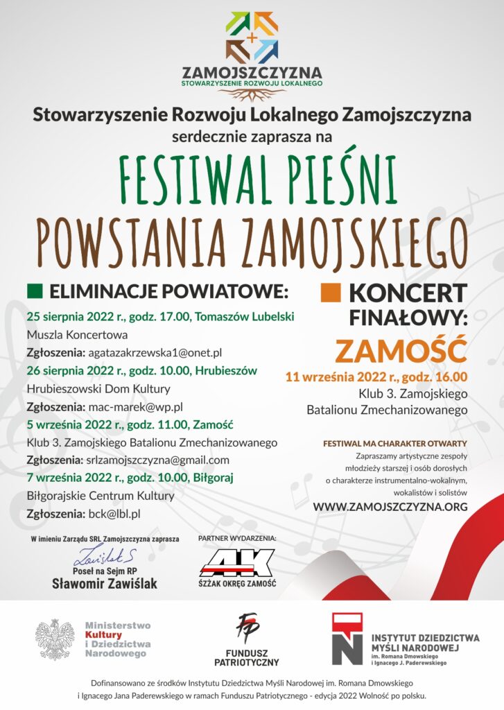 dodano: 22.08.2022Stowarzyszenie Rozwoju Lokalnego „Zamojszczyzna” zaprasza do udziału w nowym projekcie — Festiwalu Pieśni Powstania Zamojskiego, organizowanym w ramach upamiętnienia obchodzonej w tym roku 80. rocznicy wybuchu Powstania Zamojskiego. Wydarzenie jest organizowane dzięki funduszom pozyskanym z Instytutu Dziedzictwa Myśli Narodowej im. Romana Dmowskiego i Ignacego Paderewskiego Fundusz Patriotyczny — Edycja 2022.