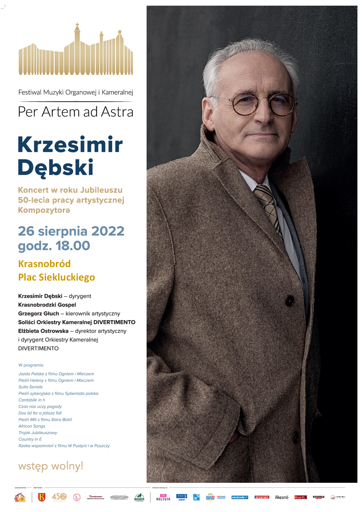 dodano: 25.08.2022Organizatorzy XVI Festiwalu Muzyki Organowej i Kameralnej „Per Artem ad Astra", serdecznie zapraszają na koncert plenerowy z udziałem Maestro Krzesimira Dębskiego, zespołu Krasnobrodzki Gospel oraz Solistów Orkiestry Kameralnej „DIVERTIMENTO". Koncert odbędzie się w roku Jubileuszu 50-lecia Pracy Artystycznej Kompozytora, w najbliższy piątek 26 sierpnia 2022r. na Placu Siekluckiego w Krasnobrodzie o godzinie 18.00.