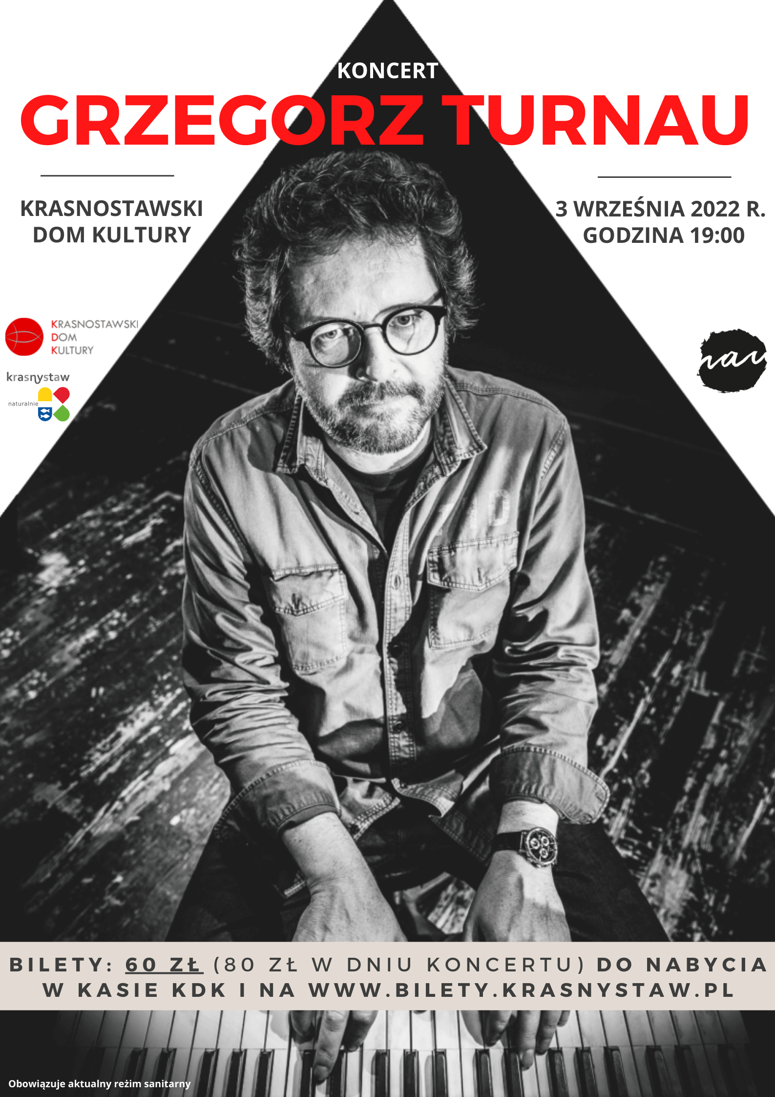 dodano: 01.09.2022Serdecznie zapraszamy na koncert Grzegorza Turnaua, który odbędzie się 3 września 2022 r. o godz. 19:00 w Krasnostawskim Domu Kultury. Bilety w cenie 60 zł (80 zł w dniu koncertu) do nabycia w kasie KDK i na www.bilety.krasnystaw.pl