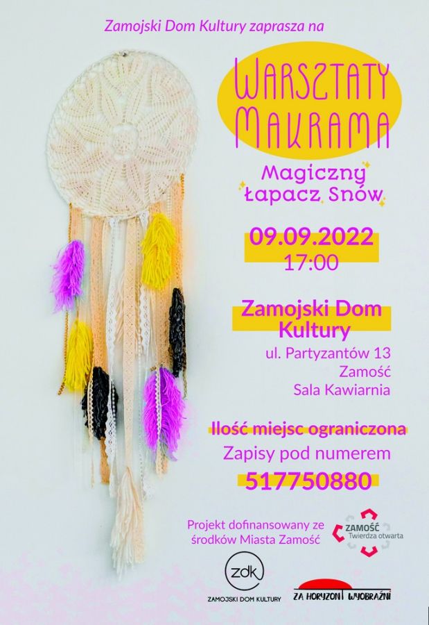 Podczas warsztatów młodsi uczestnicy naszych spotkań będą mogli sprawdzić swoje umiejętności w wyplataniu łapacza snów - amuletu plemion Indian z Ameryki Północnej. Do tego zadania posłuży nam starożytna sztuka wiązania sznurków bawełnianych bez użycia igieł, szydeł i drutów - „Makrama”.