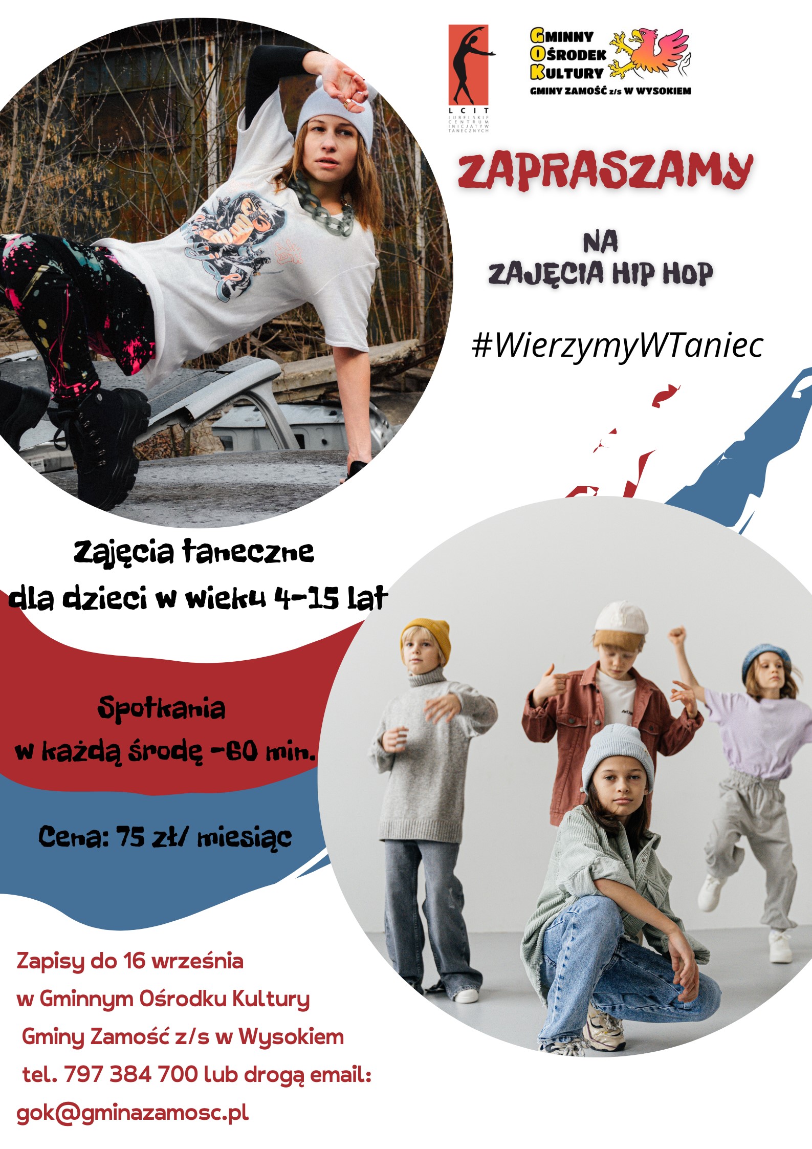Po wakacyjnej przerwie wznawiamy w GOK-u zajęcia nauki tańca HIP HOP dla dzieci w wieku 4-15 lat. Zbieramy zapisy do 17 września 2022 r. W zależności od ilości zapisanych osób mogą wystartować dwie grupy: dziecięca (dzieci w wielu 4-7 lat) i młodzieżowa (dzieci w wieku 8-14 lat). Minimalna ilość uczestników do wznowienia grupy to 10 osób. Pierwsze spotkanie w tym roku szkolnym planujemy na środę, 21 września 2022 r., o godz. 15:30, w Gminnym Ośrodku Kultury Gminy Zamość – Wysokie 154.