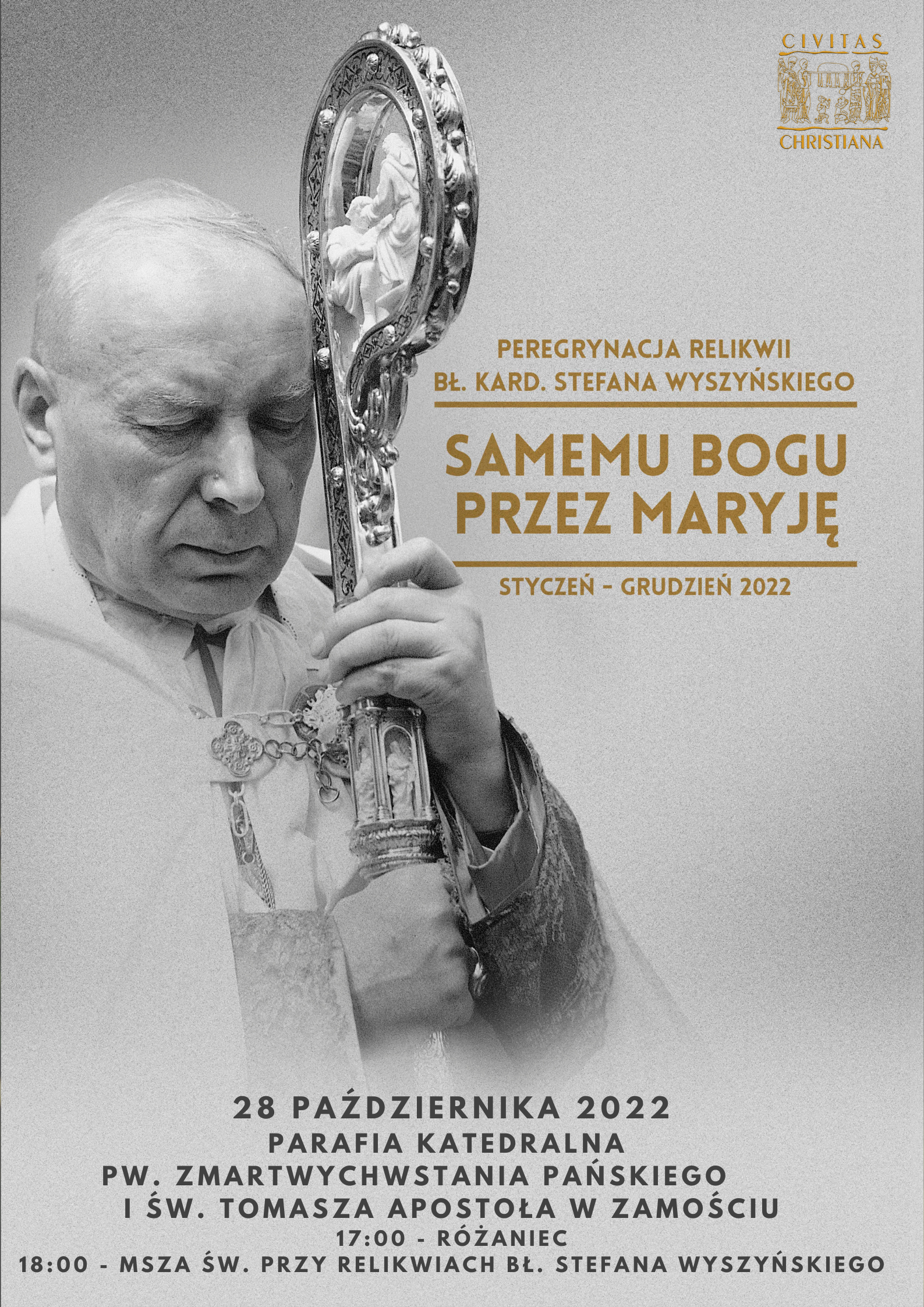dodano: 27.10.2022Katolickie Stowarzyszenia Civitas Christiana oddział w Zamościu zaprasza na wspólną modlitwę przy relikwiach błogosławionego kardynała Stefan Wyszyńskiego do katedry zamojskiej (par. pw. Zmartwychwstania Pańskiego i św. Tomasza Apostoła w Zamościu) w dniu 28.10.2022 r. (piątek).