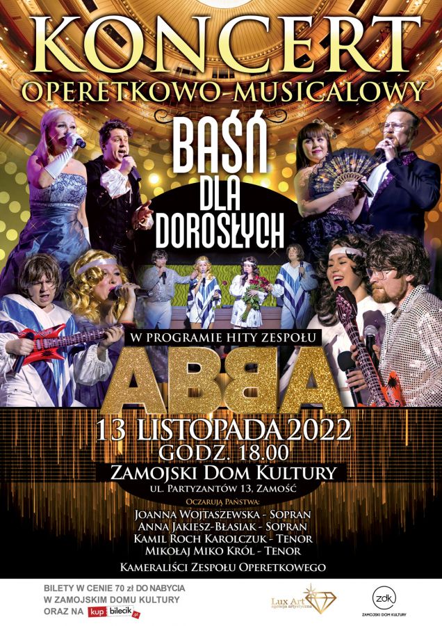 Gala cieszy się wielkim powodzeniem i uznaniem, za sprawą porywających solistów, ich poruszającej i subtelnej gry scenicznej, tańca, fantastycznego kontaktu z publicznością oraz wdzięku i uroku osobistego a do tego niesamowitej wrażliwości oraz muzykalności. Repertuar zaczerpnięty z najbardziej znanych i lubianych Operetek oraz Musicali, takich, jak: "Księżniczka Czardasza", "Wesoła Wdówka", "Baron Cygański", "My Fair Lady" czy "Upiór w Operze". Śpiewakom towarzyszą wspaniali Kameraliści Operetkowi, składający się z wybitnie uzdolnionych artystów nowego pokolenia muzycznego. Koncert jest dedykowany każdemu, kto kocha piękną, melodyjną muzykę i jest gotów by szeroko otworzyć swe serce na nowe, muzyczne i nie tylko, doznania. Zapraszamy do wspólnego muzykowania. Do zobaczenia i usłyszenia. Obsada: Joanna Wojtaszewska - Sopran Anna Jakiesz-Błasiak - Sopran Kamil Roch Karolczuk - Tenor Mikołaj Miko Król - Tenor Kameraliści Operetkowi (fortepian, skrzypce, wiolonczela) 13 listopada 2022 r., godz. 18.00, sala widowiskowa Zamojskiego Domu Kultury