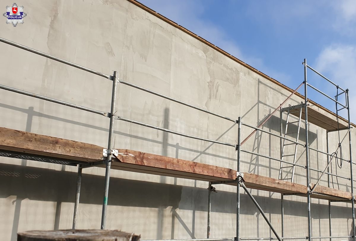 Do zdarzenia doszło wczoraj przed południem na jednym z placów budowy w Tomaszowie Lubelskim. Skierowani na miejsce policjanci wstępnie ustalili, że 49-letni mieszkaniec gminy Lubycza Królewska, pracujący przy robotach związanych z wykończeniem elewacji ściany, spadł z około czterech metrów z rusztowania. Przytomnego mężczyznę z obrażeniami ciała, niezagrażającymi jego życiu, przewieziono do szpitala. Jak się okazało, mężczyzna w organizmie miał 2,5 promila alkoholu.