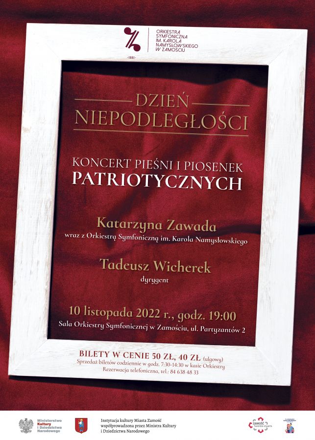 dodano: 28.10.2022Z okazji Święta Niepodległości Orkiestra Symfoniczna im. Karola Namysłowskiego w Zamościu oraz Katarzyna Zawada zapraszają na koncert pieśni i piosenek patriotycznych.