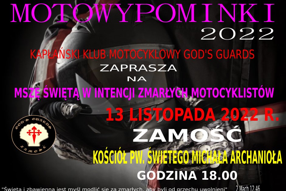 dodano: 07.11.2022W niedzielę, 13 listopada 2022 r. o godz. 18.00 w kościele pw. św. Michała Archanioła w Zamościu zostanie odprawiona Msza św. za zmarłych motocyklistów.