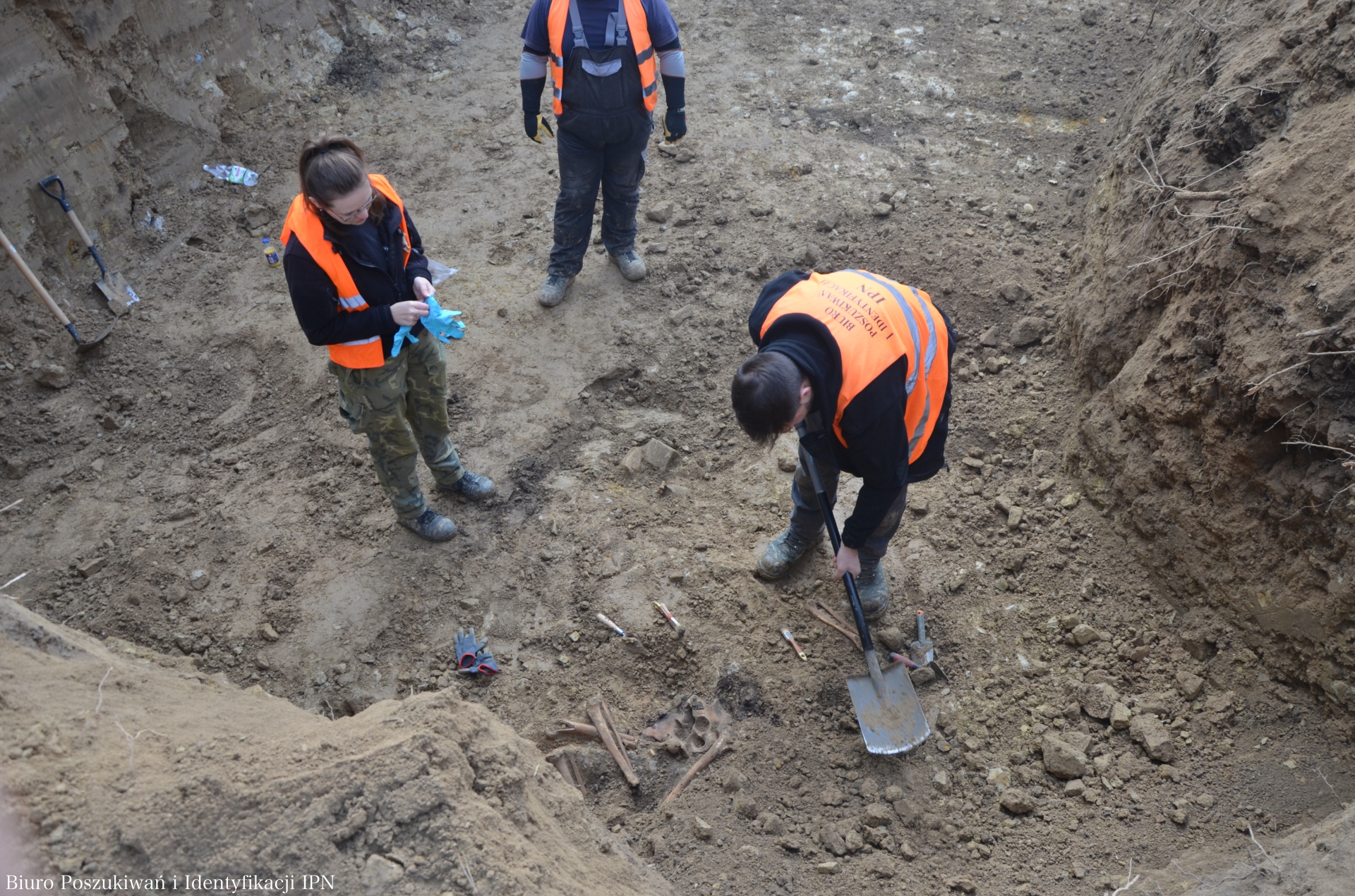 W ramach otwartego wykopu o przybliżonych wymiarach 27,00 x 5,0 m i głębokości dochodzącej do 3,7 m nie ujawniono żadnej jamy grobowej. Odnajdywane szczątki, poza wyraźnym skupiskiem w części północnej były silnie rozproszone. W całej badanej przestrzeni ujawniono również wiele nienaturalnie rozerwanych łusek wielkokalibrowych i pocisków. Skupisko kości ujawnione w części północnej zawierało szczątki przemieszczone w układzie częściowo anatomicznym, partiami w nienaturalnym ułożeniu. Część z nich, które w całości odsłonięto w ramach badanej przestrzeni, została podjęta i przekazana do dalszych badań. Pozostałe zlokalizowane w profilach bocznych, pozostawiono do następnego etapu badań, zabezpieczając je w odpowiedni sposób przed zniszczeniem czy przemieszczeniem, jakie mogłyby nastąpić podczas zasypywania wykopu. Ich podjęcie w czasie obecnych prac, ze względu na konieczną do zastosowania metodologię badań oraz niezbędny do ich przeprowadzenia czas było niemożliwe.
