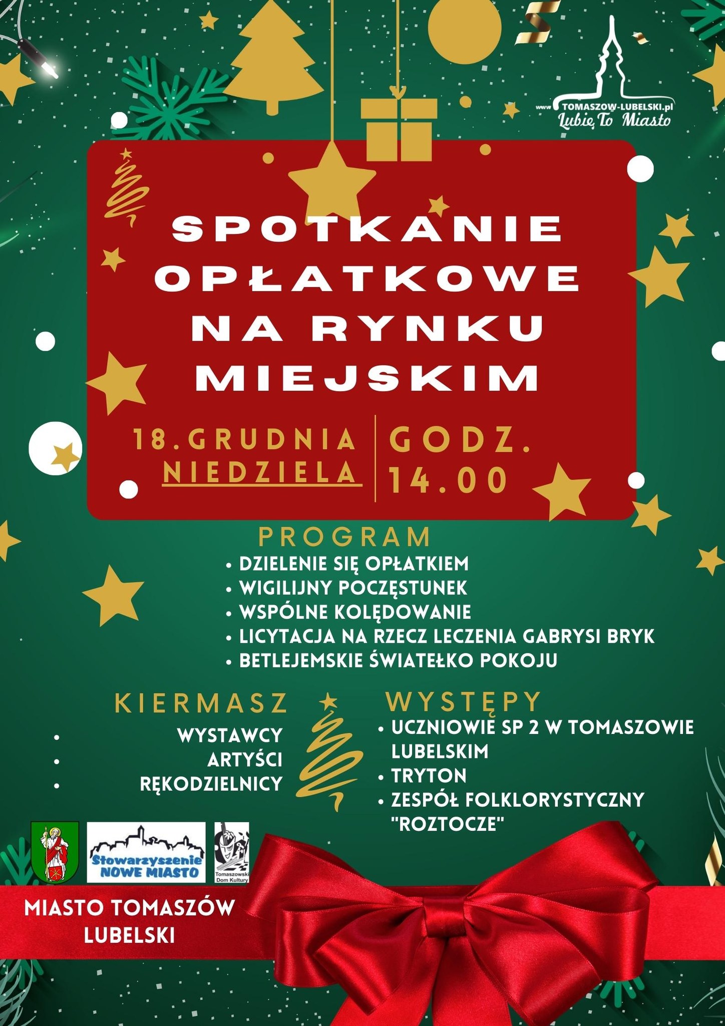 dodano: 14.12.2022Rada Miasta i Burmistrz Miasta Tomaszów Lubelski Zapraszają w dniu 18 grudnia 2022 r, godz. 14.00 na SPOTKANIE OPŁATKOWE - Rynek Miejski w Tomaszowie Lubelskim