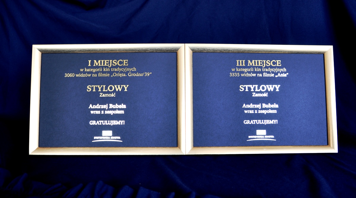 dodano: 22.12.2022Centrum Kultury Filmowej "Stylowy" w Zamościu zostało wyróżnione za najlepsze wyniki frekwencyjne, w kategorii kin tradycyjnych, w rozpowszechnianiu filmu dokumentalnego „Ania” oraz dramatu historycznego „Orlęta. Godno ‘39”. Nagrody przyznała TVP Dystrybucja Kinowa. Wyróżnienie zostało wręczone podczas 51. Forum Wokół Kina w Gdyni. Odebrał je Andrzej Bubeła - dyrektor zamojskiego kina.