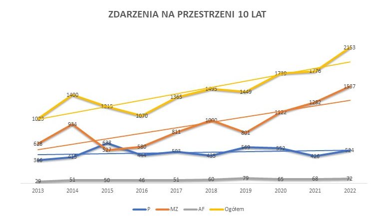 W 2022 r., odnotowano łącznie 2153 interwencji z czego: 524 to pożary, 1537 miejscowych zagrożeń oraz 72 alarmy fałszywe. W porównaniu do 2021 roku o 21,2% (tj. o 377 zdarzeń) wzrosła ogólna liczba interwencji, o 23% (tj. 99 zdarzeń) wzrosła ilość pożarów, natomiast o 19,9% (tj. 255 zdarzeń) zwiększyła się liczba miejscowych zagrożeń. Alarmy fałszywe utrzymywały się na porównywalnym poziomie, w 2022 r., było ich 72, o 4 więcej niż w roku ubiegłym. Analizując linię trendu dla poszczególnych rodzajów zdarzeń, na przestrzeni ostatnich 10 lat należy stwierdzić, że rosnące trendy można zauważyć w grupie pożarów i miejscowych zagrożeń.