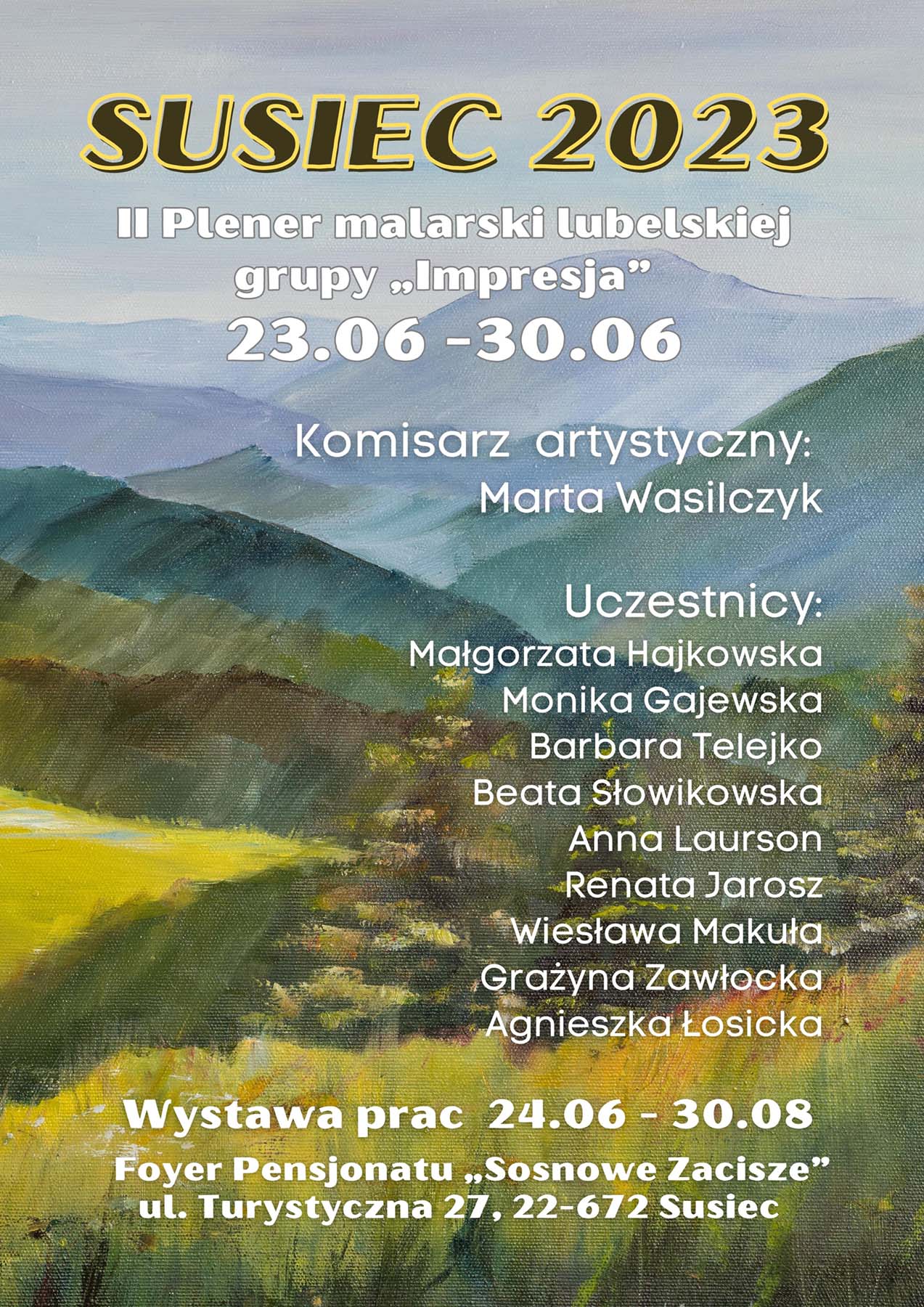 dodano: 12.06.2023II Plener malarski grupy plastyków „Impresja” Susiec 2023 w dniach 23.06 -30.06 z siedzibą: Pensjonat "Świerk" gospodarstwo agroturystyczne Pani Lucyny Kozyry Adres: UL. DŁUGA 28, 22-672 Susiec Telefon: 84 665 48 08