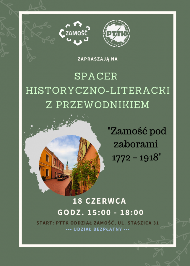 dodano: 15.06.2023Zapraszamy na bezpłatny 3-godzinny spacer historyczno-literacki z przewodnikiem PTTK: "Zamość pod zaborami"