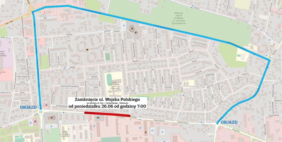 Pierwszy etap zamknięcia ul. Wojska Polskiego obejmuje odcinek od skrzyżowania z ul. Sowińskiego do skrzyżowania z ul. Kalinową i zostanie wprowadzony w poniedziałek 26 czerwca br., od godz. 7:00.