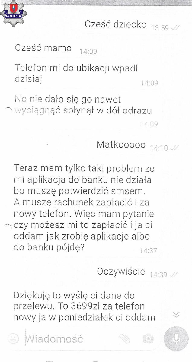 60-letnia mieszkanka Zamościa otrzymała smsa o treści: „cześć mamo to jest mój nowy numer telefon, wyślij mi wiadomość na whatsapp”. Przekonana, że wiadomość rzeczywiście pochodzi od jej córki nawiązała korespondencję. W kolejnych wiadomościach rzekoma córka wyjaśniała, że telefon wpadł jej do ubikacji i musi teraz zapłacić za nowy aparat a nie ma dostępu do swojego rachunku. O pomoc poprosiła 60-latkę. Kobieta przekonana, że pomaga prawdziwej córce na wskazany w wiadomości numer konta przelała ponad 3500 złotych.