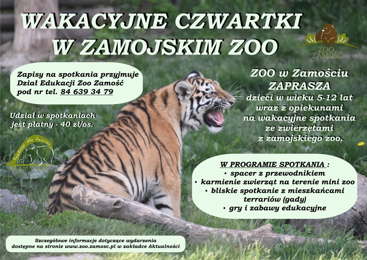 Wszystkich zainteresowanych WAKACYJNYMI CZWARTKAMI W ZAMOJSKIM ZOO ZAPRASZAMY do dokonywania rezerwacji terminu w Dziale Edukacyjnym zamojskiego zoo pod nr tel. 84 639 34 79.