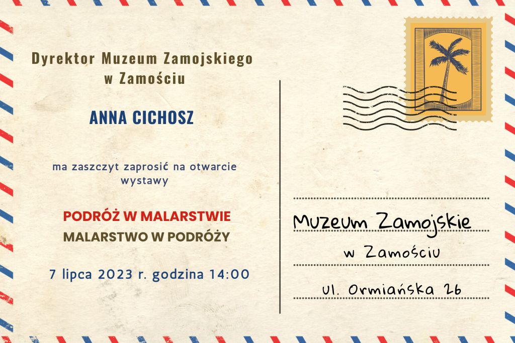 dodano: 30.06.2023Dnia 7 lipca 2023 r., o godzinie 14:00 w Muzeum Zamojskim w Zamościu odbędzie się wernisaż wystawy czasowej „Podróż w malarstwie | Malarstwo w podróży”.