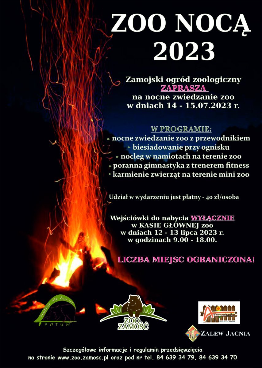 Ogród zoologiczny w Zamościu SERDECZNIE ZAPRASZA na niezapomnianą noc w otoczeniu dzikich zwierząt. Już wkrótce (z 14 na 15 lipca 2023 r.) odbędzie się niesamowite wydarzenie - "ZOO NOCĄ 2023"