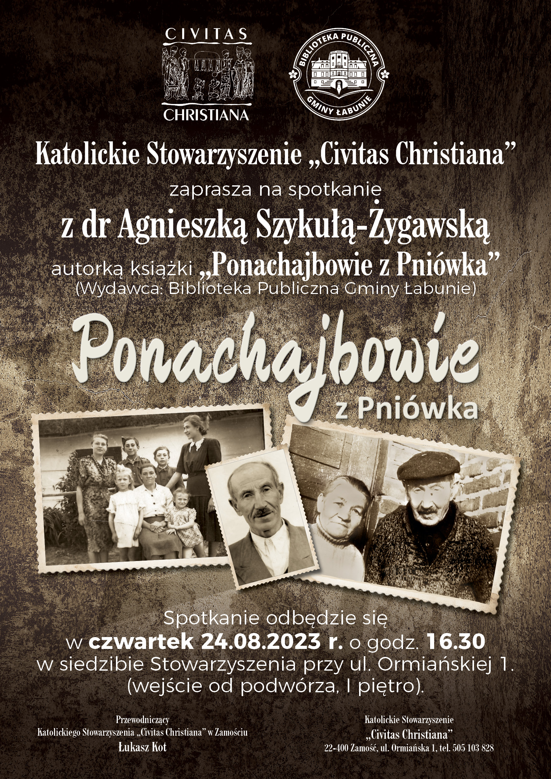 dodano: 23.08.2023Katolickie Stowarzyszenie ,,Civitas Christiana” w Zamościu zaprasza na spotkanie z dr Agnieszką Szykułą-Żygawską autorką książki pt. „Ponachajbowie z Pniówka”.