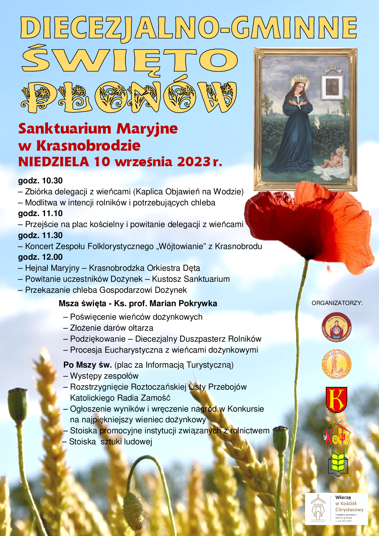 dodano: 04.09.2023Biskup Zamojsko-Lubaczowski, Duszpasterz Rolników Diecezji Zamojsko-Lubaczowskiej, Proboszcz Parafii Nawiedzenia NMP w Krasnobrodzie i Burmistrz Krasnobrodu serdecznie zapraszają na Diecezjalno – Gminne Święto Plonów, które odbędzie się w Krasnobrodzie 10 września 2023r.