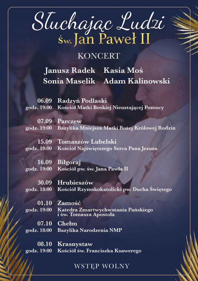 We wrześniu i październiku koncerty pt. “Słuchając Ludzi - św. Jan Paweł II” będzie można obejrzeć w 8 miejscowościach Województwa Lubelskiego - 1 października, w niedzielę, o godz. 19:00 w Katedrze Zmartwychwstania Pańskiego i Św. Tomasza Apostoła w Zamościu.