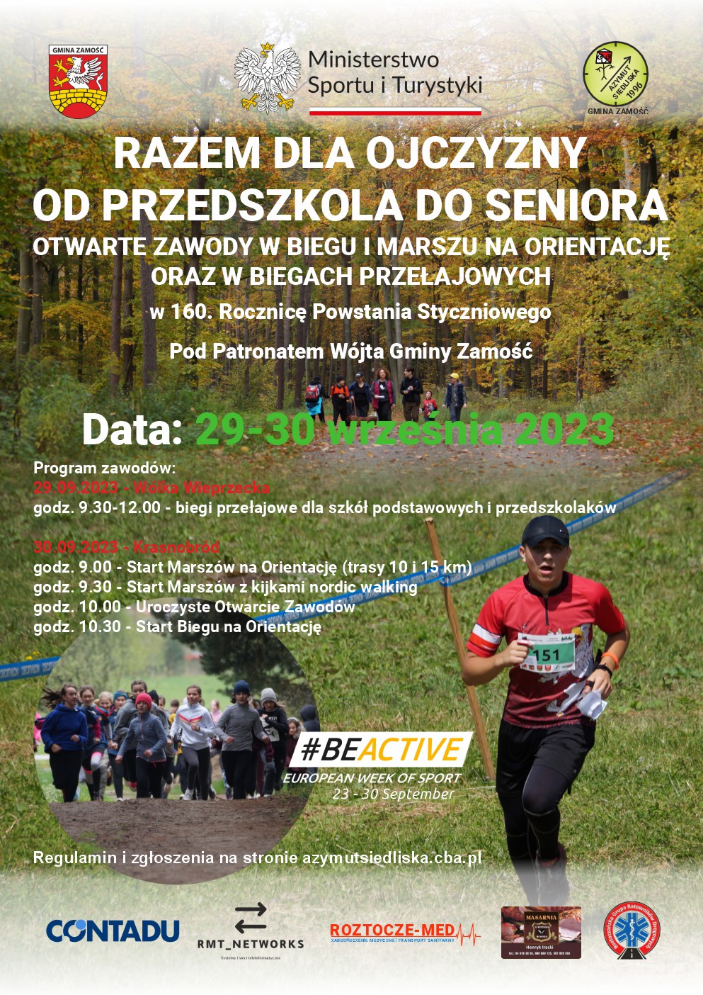 dodano: 22.09.2023Klub Sportowy „Azymut” Siedliska oraz Gmina Zamość, serdecznie zapraszają do udziału w zawodach pn. „Razem dla Ojczyzny – od przedszkola do seniora – Otwarte zawody w biegu i marszu na orientację z okazji 160. Rocznicy Powstania Styczniowego” pod Honorowym Patronatem Wójta Gminy Zamość.