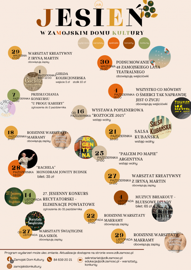 Program jesiennych wydarzeń może ulec zmianie. Zachęcamy do odwiedzania strony internetowej www.zdk.zamosc.pl oraz mediów społecznościowych – tam informacje będą na bieżąco aktualizowane. Do zobaczenia w Zamojskim Domu Kultury!