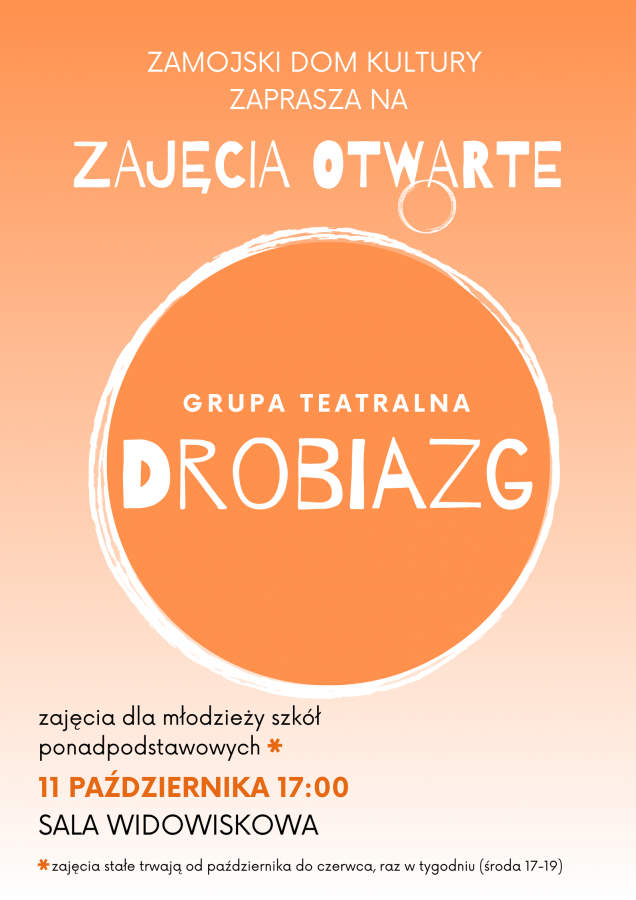 dodano: 05.10.2023Zapraszamy młodzież w wieku od 15 lat na zajęcia otwarte Grupy Teatralnej Drobiazg.