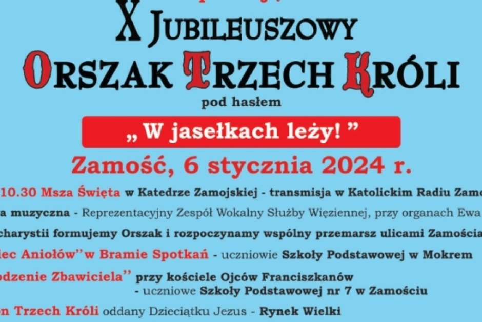 dodano: 04.01.2024Stowarzyszenie Sympatyków Orszaku Trzech Króli w Zamościu informuje, że w dniu 6 stycznia 2024 roku w święto Objawienia Pańskiego odbędzie się X Jubileuszowy Orszak Trzech Króli w Zamościu pod patronatem duchowym J.E. Biskupa Zamojsko-Lubaczowskiego Mariana Rojka, oraz patronatem honorowym Marszałka Województwa Lubelskiego Pana Jarosława Stawiarskiego, Prezydenta Miasta Zamościa Pana Andrzeja Wnuka, Wójta Gminy Zamość Pana Ryszarda Gliwińskiego.