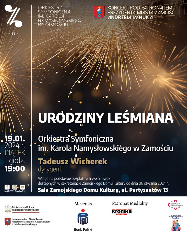 dodano: 05.01.2024Prezydent Miasta Zamość, Andrzej Wnuk ma przyjemność zaprosić na koncert z okazji URODZIN LEŚMIANA w wykonaniu Orkiestry Symfonicznej im. Karola Namysłowskiego w Zamościu pod dyrekcją Tadeusza Wicherka.