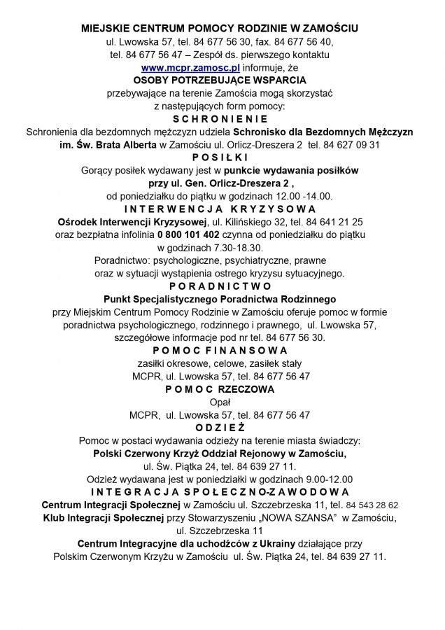 Osoby wymagające pomocy i wsparcia mogą zgłaszać się do: