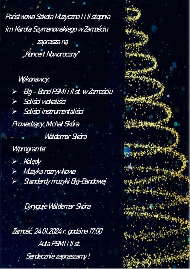 dodano: 11.01.2024Państwowa Szkoła Muzyczna I i II stopnia im. Karola Szymanowskiego w Zamościu zaprasza na „Koncert Noworoczny”